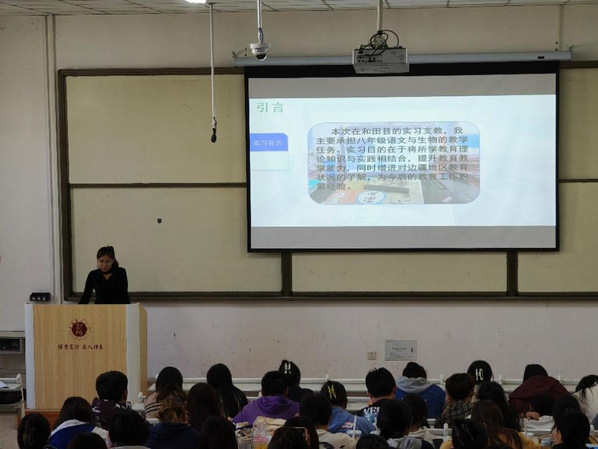 各位实习生代表分别介绍了各自分配地区和学校简况;教学内容包括课堂教学,包括备课,上课,修改作业,批试卷,辅导学生学习等。在实习过程中执行以学生为主,老师为辅的教学方式,课堂以学生的朗读和提问为主,让学生充当小老师的角色讲评,老师再加以补充、纠正。课堂都是以学生讲为主,这样能充分调动学生学习的主动性和积极性,由“要我学”转化为“我要学”的教学方式。为22级生科专业师范生明年的实习支教分享经验。