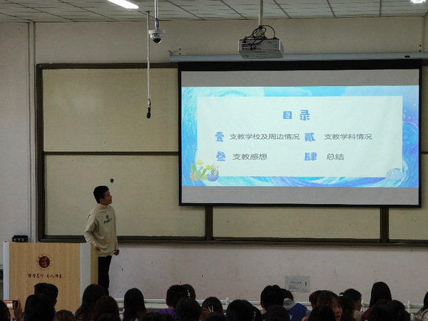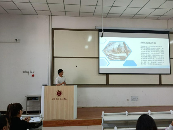 张明林同学从日常生活、教学工作两方面分享了他的支教经验。他表示,初上讲台,面对一双双求知若渴的眼睛,他感受到了前所未有的责任感和使命感。为了让孩子们更好地掌握知识,精心备课,尝试用生动有趣的教学方式激发他们的学习兴趣。课堂上,鼓励孩子们大胆发言,勇于表达自己的观点;课后,耐心辅导,帮助那些基础薄弱的同学追赶上来。渐渐地,他看到了孩子们成绩的进步,更看到了他们眼中闪烁的自信光芒。
